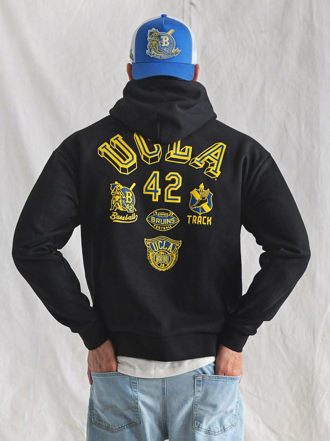 He was a sports montage of greatness, and he went on to become one of the most significant – and truly revered – athletes of all time. As part of our “culture and influence” spotlight in the month of February, we have a new black heavyweight hoody & Bruin blue trucker hat paying homage to Jackie Robinson, a man whose impact was immeasurable.