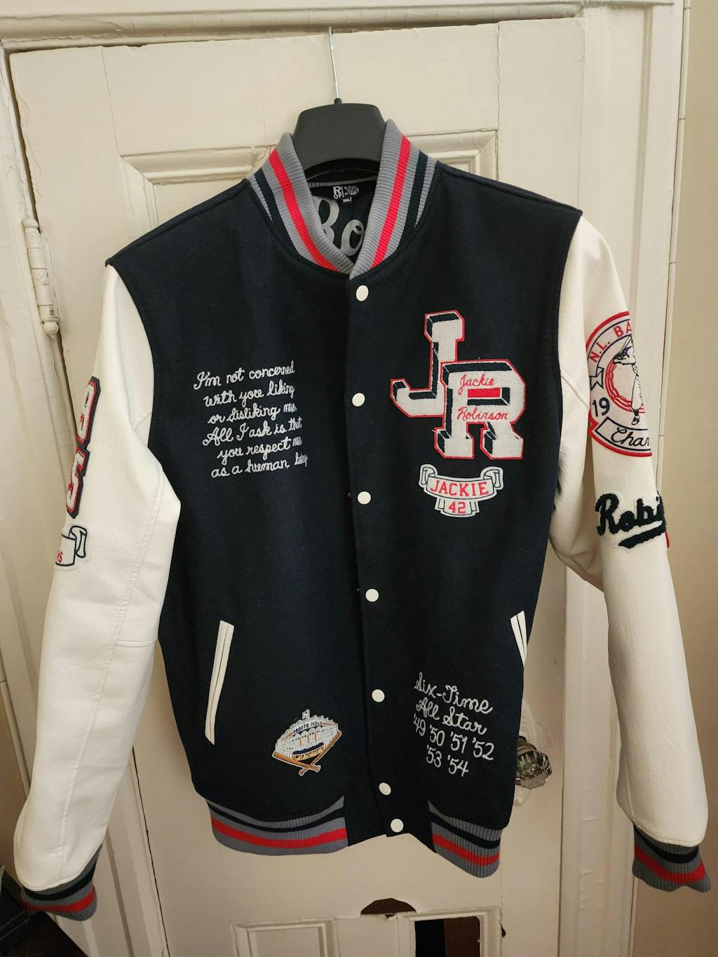 Beautiful jacket! Attention to detail, stitching is clean, detailed patches, the leather sleeves are very soft; unlike many other varsity jackets. The picture of Jackie Robinson on the lining of the jacket sets it apart from many.